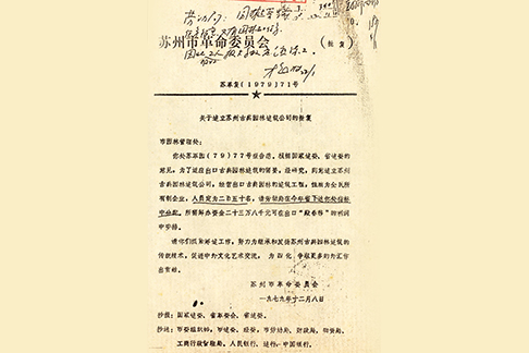 1982年 5月,苏州市编制委员会通过《关于同意建立苏州园林设计室的批复》(苏编发(82)23号),苏州园林设计室(苏州园林设计院的前身)成立。